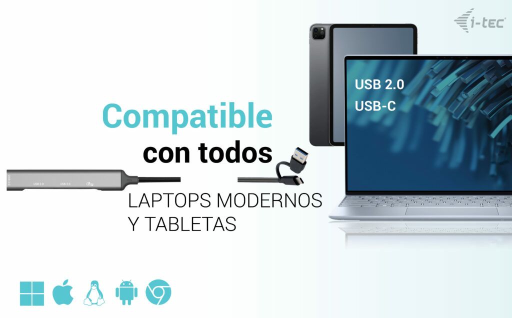 ESTE **HUB MULTIPUERTO COMPACTO Y METÁLICO** ES UNA SOLUCIÓN VERSÁTIL PARA QUIENES NECESITAN AMPLIAR LA CONECTIVIDAD DE SU EQUIPO, YA SEA UN PORTÁTIL, TABLET O SOBREMESA. GRACIAS A SU DISEÑO MIXTO CON **ENTRADA USB-C O USB-A**, OFRECE COMPATIBILIDAD CON UNA AMPLIA VARIEDAD DE DISPOSITIVOS MODERNOS Y TRADICIONALES. IDEAL PARA EL ENTORNO DE TRABAJO, ESTUDIO O USO DOMÉSTICO, PERMITE CONECTAR PERIFÉRICOS DE MANERA RÁPIDA Y EFICIENTE.