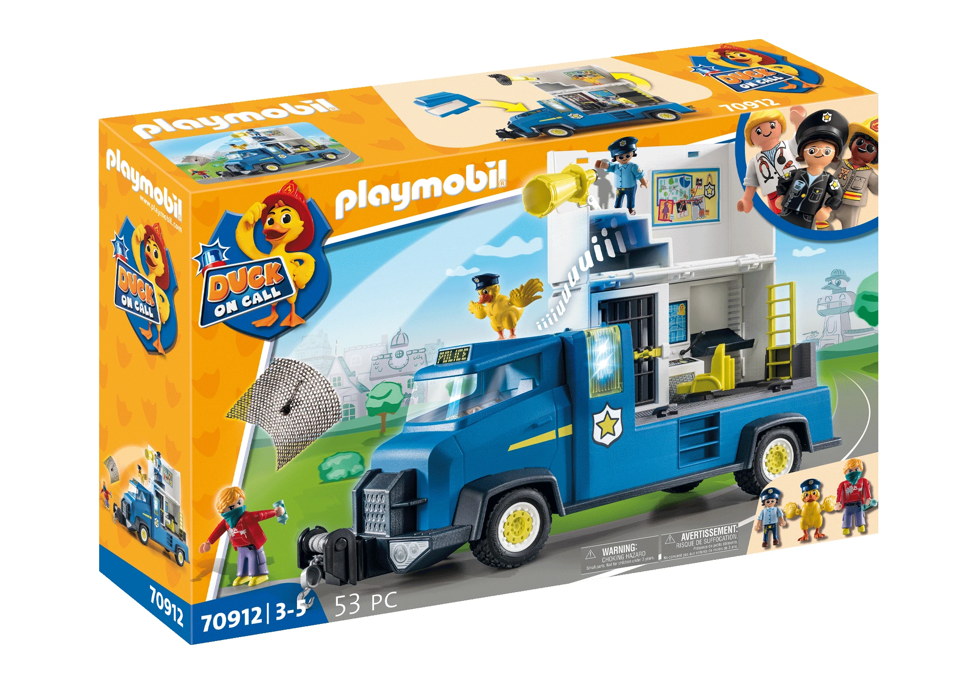 Playmobils 70912 Playmobil duck on call camion de policia Camión Playmobil Duck On Call Plizei con efectos de luz y sonido integrados. Los villanos pueden ser capturados en la estación de comando con bisagras con celda de prisión. ¡Espero que no intenten escapar! Juego de juguetes para niños de 4 años en adelante ideal para las manos de los niños debido al tamaño apropiado para la edad y la sensación agradable con bordes redondeado. Juego diario instrucciones para ensamblar junto con los padres, diseño robusto y de alta calidad, limpie las piezas (sin pegatinas) con agua corriente sin productos químicos.